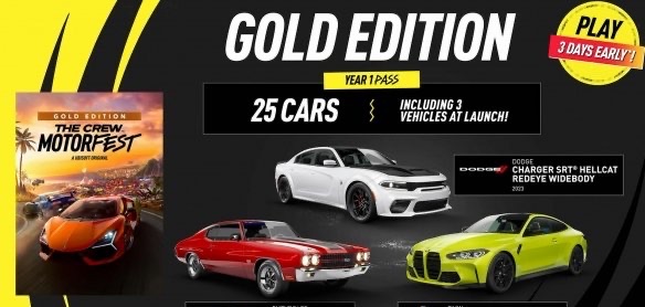如果你购买了第一年通行证,你可以在9月11日至14日抢先体验举行的“美国肌肉活动”,通行证用户还会得到25辆额外的汽车。【足记网】游戏发售后第一个月中,玩家将会先得到3辆新车,它们分别是:The Dodge Charger SRT Hellcat Redeye Widebody 2023、Chevrolet Chevelle SS 1970和BMW M4 Competition Coupe 2021。