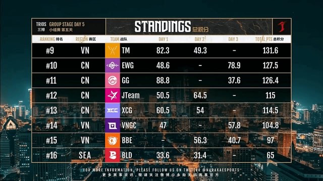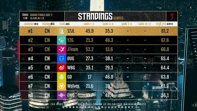 但jTeam从不轻言放弃。下半场开始奋起直追,成功在第九局拿到一把大分天选,并在每局都有不错的击杀分入账,相对稳定。而他们的直接竞争对手17JL、YZG、OUG的状态起伏较大,所以在第十一局结束后,他们以微弱的优势霸占了积分榜榜首的位置。