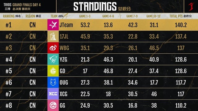 这样的战术执行显然效果不错,最终他们在决胜局拿到了第四名的成绩,加上WBG战队成功将17JL、YZG两大竞争对手纷纷淘汰出局,他们以2.8分的微弱优势领先17JL战队,成功卫冕。