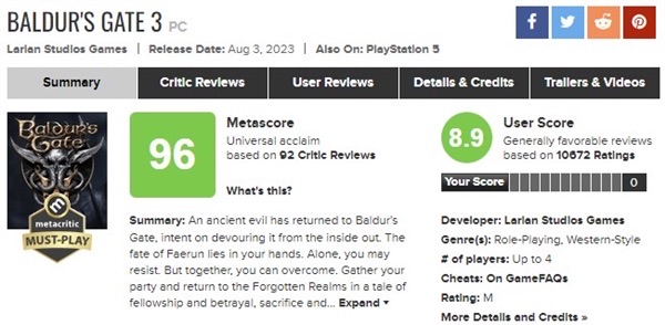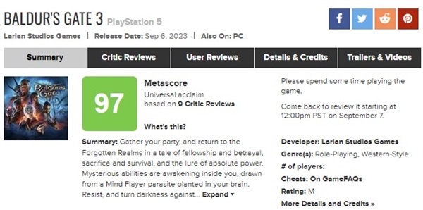 另外,《博德之门3》在PS5平台发布后赢得广泛赞誉,其媒体平均分甚至(暂时)高于PC版: