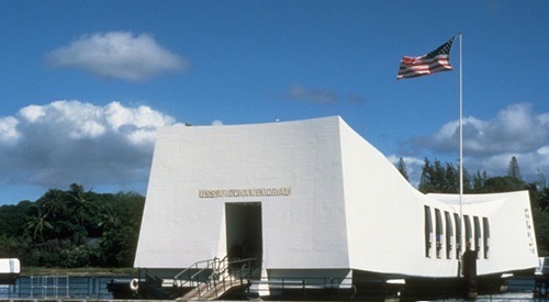 美国亚利桑那号战舰纪念馆:图为纪念馆的正前方。亚利桑那号不仅是一座纪念馆,还是一座墓碑。在珍珠港事件中阵亡的900多名海员的遗体仍在这艘已经沉没的战舰上。