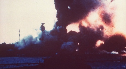 美国亚利桑那号战舰的起火和沉没:亚利桑那号战舰在珍珠港事件中遭受重创,是美军损失程度最严重,人员伤亡最多的战舰。
