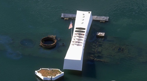 美国亚利桑那号战舰纪念馆鸟瞰图:纪念馆建于沉没的亚利桑那号战舰的残骸之上。船体的大量残骸和汽油仍会缓慢渗入水中。