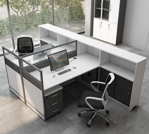 4、屏风办公桌:将办公之间通过屏风分隔成不同区域的办公桌,一般是几个拼接在一起。