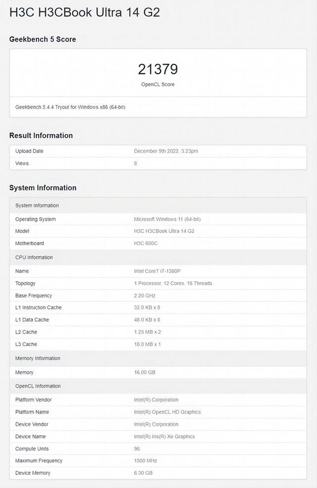 i7-1360P在Geekbench上的跑分是在H3C的H3CBook Ultra 14 G2笔记本电脑上,运行的是Windows 11系统,16GB的内存,跑分方面,i7-1360P单核成绩是1665,多核成绩是10595,OpenCL跑分成绩是21379,Vulkan跑分成绩是17617,这与常见的i7-1260P的跑分成绩相差无几。