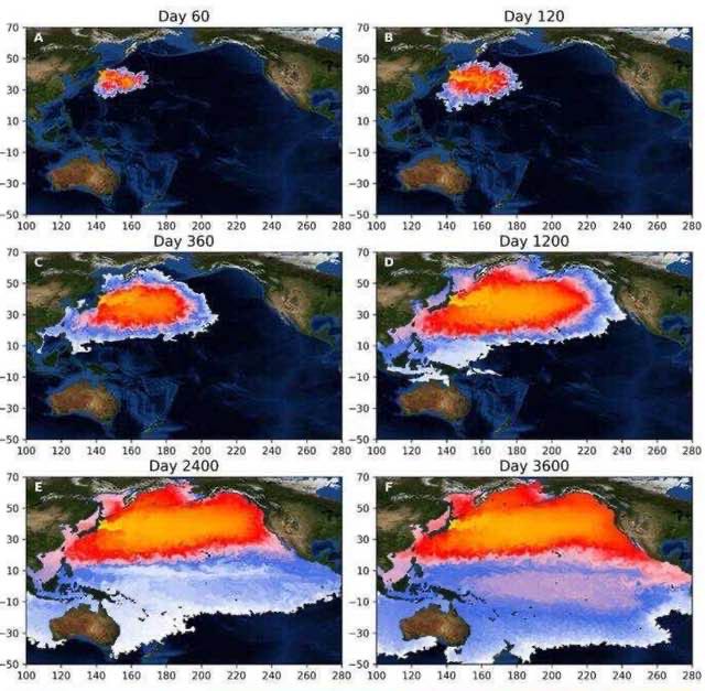研究机构预测【图2】:核污水将随着洋流和海洋环流逐渐扩散至中国沿海(约240天)。随后,污水将进一步向内陆扩散,1200天后覆盖北太平洋。【足记网】
