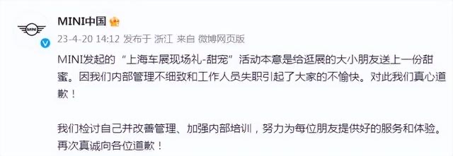 MINI发起的“上海车展现场礼-甜宠”活动本意是给逛展的大小朋友送上一份甜蜜。因我们内部管理不细致和工作人员失职引起了大家的不愉快。对此我们真心道歉!我们检讨自己并改善管理、加强内部培训,努力为每位朋友提供好的服务和体验。再次真诚向各位道歉!