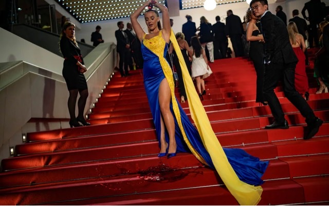 第76届戛纳国际电影节16日晚在法国南部城市戛纳拉开帷幕。据英国《每日电讯报》等媒体22日报道,此次电影节期间出现插曲,一名身穿乌克兰国旗颜色服装的抗议者将假血倒在自己的身上,随后安保人员立刻将这名抗议者带走。现场画面显示,这名女子站在戛纳红毯的楼梯上,从衣服内拿出两袋假血包,并将其从自己的头上泼下。
