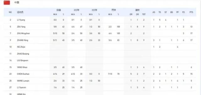 张宁17分9板3助,祝铭震17分2板,邹阳13分9板1助,陈国豪15分7板2助2帽。