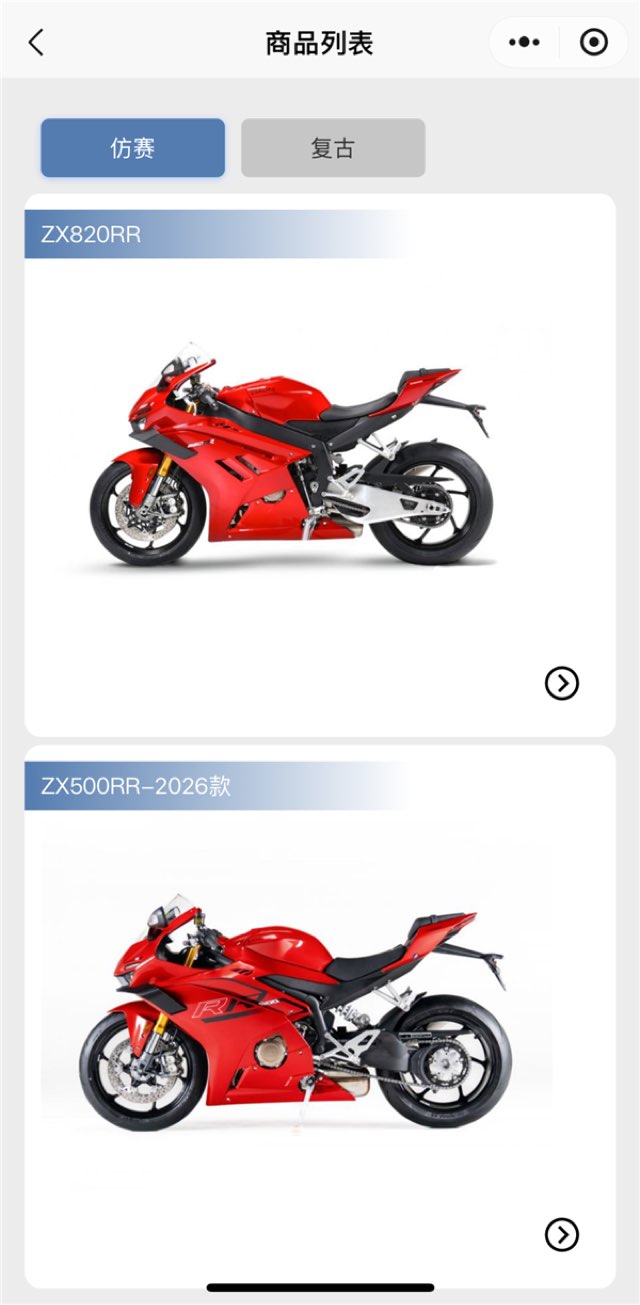 3月21日,新产品ZX 820RR和ZX 500RR在微信小程序开启独家发售。