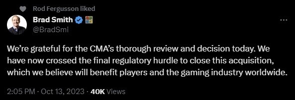 微软总裁布拉德·史密斯迅即回应说,CMA如此深思熟虑,我们佩服得紧,如今最后的堡垒也被攻克,我们终于能安排交易了,收购必将惠及全球玩家与游戏业。