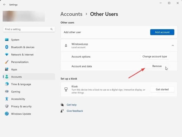 通过单击“删除”按钮来删除 Windows 11 中的帐户