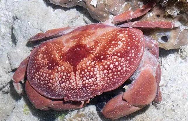 雷诺氏鳞斑蟹原产于菲律宾,它的背面底色是米黄或淡橙色,在我国主要分布在台湾近岸珊瑚礁和岩礁,体内也含有河豚毒素和麻痹性贝毒。