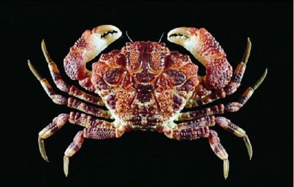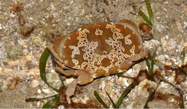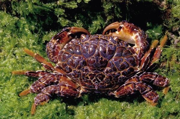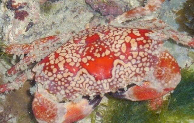 绣花脊熟若蟹又叫做马赛克蟹,全身长满红白相间的网状花纹。在我国分布于台湾北部沿岸。