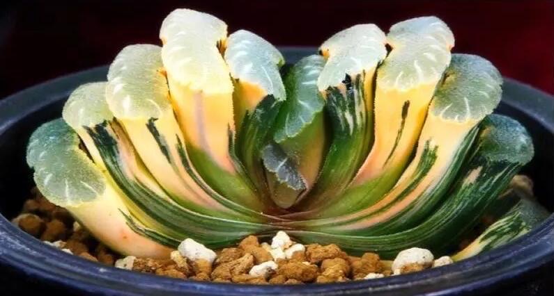 或许很多人看到万象锦,都会觉得是被切割过的多肉,叶面上有不规则的斑纹,大多是黄色的,有时候也会混杂着橘红色和黑色,顶端露出娇嫩且脆弱的内里,没有其他的枝叶包裹。万象锦是一种群聚形式生长的多肉,多疑都是一簇簇生长的。