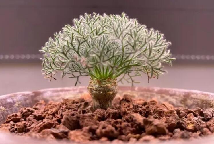 同样,白皮月界长得也和普通常见的多肉不同,极具辨识度,白色的根上长出翠绿的像雪松一般的松针,来自非洲纳米比亚。多肉给我们的感觉都是柔软的,但白皮月界不同,根非常坚硬,但又比树根软,长相绮丽。