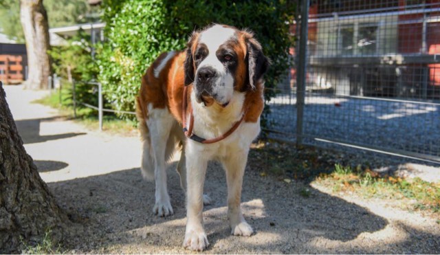 圣伯纳犬是瑞士的国宝之一,虽然圣伯纳犬的身高为90公分左右,体重为100公斤左右,但是它的性格却十分温顺。