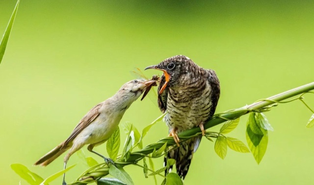 杜鹃鸟的父母都是自私自利的,对儿女抚养都不负任何责任。到了繁殖期,杜鹃鸟会把自己的卵产在芦苇莺的巢中,由芦苇莺抚养长大。傻傻的芦苇莺在毫不知情的情况下,替别人养着小孩。