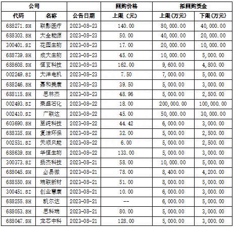 8月18日以来公告回购金额上限5000万元或以上的部分公司