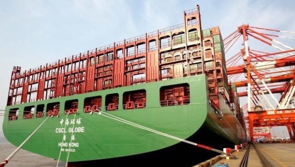 中海环球号货轮是2014年度世界上最大、最先进的集装箱船,同时也是中国海运集团订制的5艘19100 TEU型集装箱船中的首条船,该船全长400米,宽度约为60米,整个船体的大小超过4个标准足球场,船身的长度比美国海军“尼米兹”号航空母舰还要多出67米,堪称“海上巨物”。