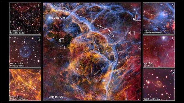 船帆座超新星遗迹本身具有至关重要的天文意义。它让我们很好地了解了这样一个遗迹发展的后期阶段,并深入了解了超新星喷出的物质是如何逐渐扩散到星际介质中的,星际介质是充满恒星之间空间的薄气体雾。形成船帆座超新星遗迹的古老恒星爆炸产生的冲击波仍在向太空膨胀,在那里它与星际介质碰撞并压缩,形成了我们在图像中看到的细腻细丝。在超新星残骸中也检测到了钙、碳、铜、锗、氪、镁、镍、氧和硅等元素的吸收线,其中许多元素是电离的和双重电离的。这些重元素要么是由恒星爆炸前的聚变过程锻造而成,要么是由爆炸本身释放出的凶猛能量锻造而成。