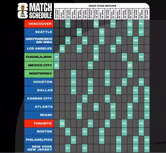 2026年美加墨世界杯小组赛将于北京时间2026年6月12日至2026年6月28日进行、1/16决赛将于2026年6月29日至2026年7月4日进行、1/8决赛将于北京时间2026年7月5日至2026年7月8日进行、1/4决赛将于北京时间7月10日至2026年7月12日进行、半决赛将于北京时间7月15日至2026年7月16日进行、季军赛将于北京时间2026年7月19日进行、决赛将于北京时间2026年7月20日进行。