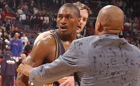 由于双方在场上都太过强硬,比赛的火药味也越来越浓,甚至连裁判的吹罚尺度也开始飘忽不定,于是,在比赛的最后45秒里,一场NBA史上最大规模的斗殴事件开始爆发。