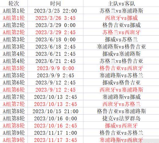A组详细赛程表