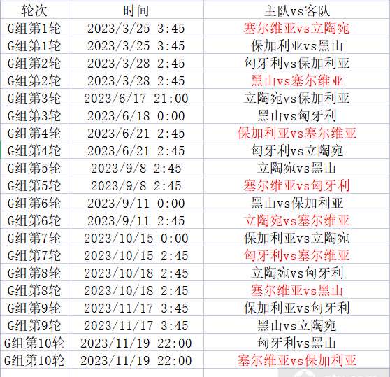 G组详细赛程表