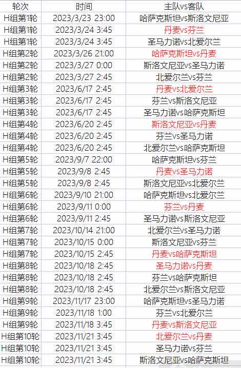 本届欧洲杯预选赛首场比赛是H组两支弱旅之间的对话,哈萨克斯坦将在主场迎战斯洛文尼亚。这场比赛将在北京时间3月23日23:00进行。欧洲杯预选赛最后一天是11月22日,共有四场比赛同时进行,分别是: