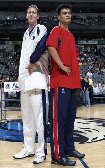 诺维茨基2米13,东契奇2米01,这两人10cm左右差距没问题,但是姚明比诺维茨基高了了太多,东契奇感觉就像1米9,这看上去确实不止2米26。