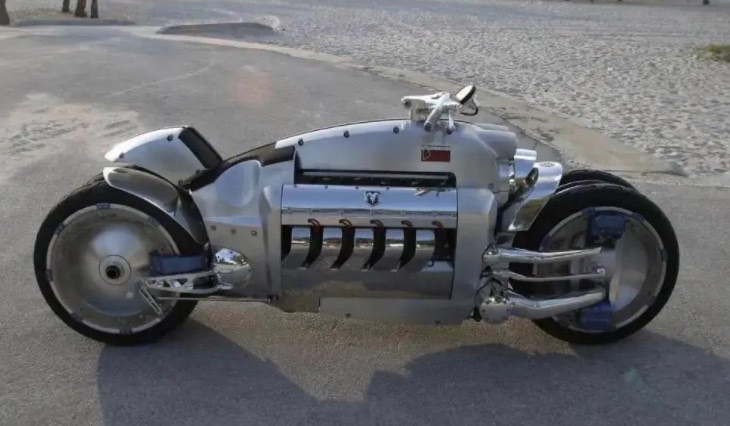 "道奇战斧"搭载道奇蝰蛇500马力的V10引擎为其提供强悍动力,异于普通摩托前后单轮的四轮设计也保证了它行驶时的安定性。不过与此相比,速度太快导致橡胶轮胎与地面剧烈摩擦生热从而引发机体燃烧,这才是最让人担心的。