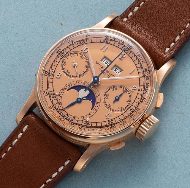 1941年问世的1518,是百达翡丽第一次将万年历、计时两种功能结合在一起。开创了后世百达翡丽万年历计时的经典地位。这只1518使用玫瑰金表壳加玫瑰金颜色盘面,被称为“粉上加粉”,存世13只。而埃及王子穆罕默德将他的这一只“遗忘”在了保险箱里,因此又获得了极佳品相和名人加成。