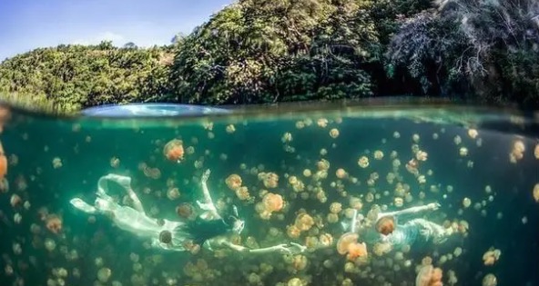 帕劳水母湖里生存着世界上独一无二的无毒水母,这些水母原本来自大海,但在数万年前因为地壳运动导致地床上升,后逐渐形成了一个湖。而原本生活在湖里的海洋动物后都灭绝了,只有水母靠着海藻分泌的营养素繁殖了下来,后这个湖也成为了水母的天堂。