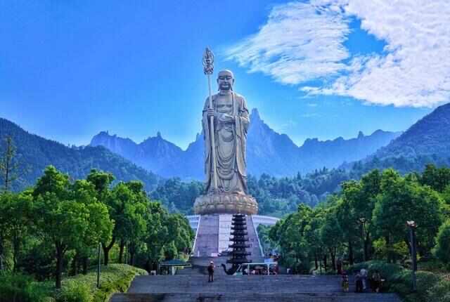 九华山地藏菩萨露天铜像,像身高度84米,加上莲花座底盘高度99米,是世界上最大最高的佛教造像之一。地藏菩萨为比丘相,右手持锡杖,左手持摩尼宝珠。面向西北方,端庄慈祥,以示“昭示众生,国泰民安”。