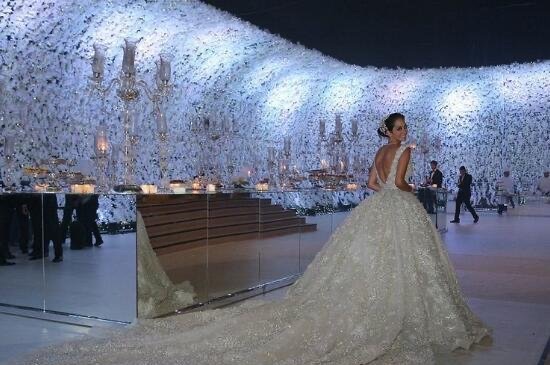从拉娜的Elie Saab定制礼服,到源自路易-威登灵感的鲜花塔,这次婚礼之奢华可令人惊掉下巴,被称为震惊世界的婚礼。这对夫妇在新娘位于黎巴嫩南部的住宅交换结婚誓言,随后在贝鲁特最大会场BIEL举行了盛大的招待会。
