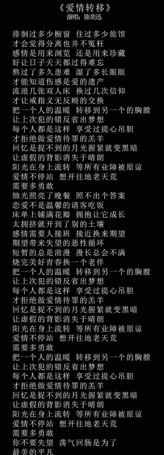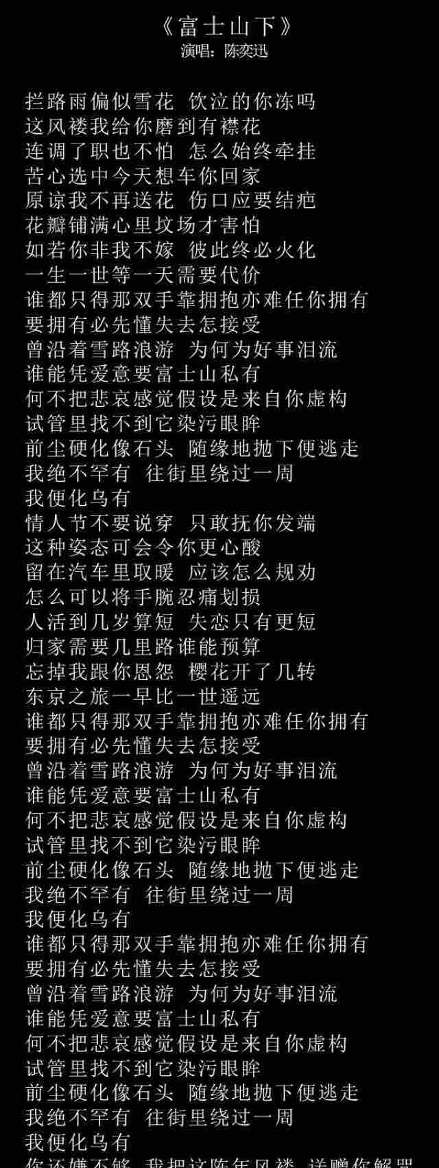 《富士山下》歌词 《爱情转移》歌词《富士山下》收录在专辑《认了吧》中,由环球唱片在2006年11月23日发行。《爱情转移》收录在《What’S Going On...?》中,于2007年4月24日发行。