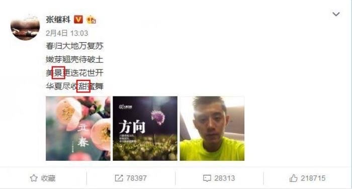 喜欢科科的朋友都知道,他可是一个被体育事业耽误的诗人,平时最大的爱好就是在微博里写诗。2018年2月4日,灵魂诗人张继科又在微博上发表了他的大作,就是在这首诗里,网友又发现了苗头。第三句中的“景”,第四句中的“甜”,连起来不就是景甜吗?连告个白都这么文艺,乒乓小王子真的是没谁了。
