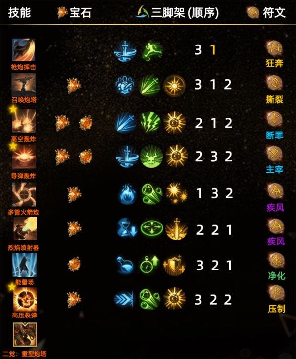 职业特性总结:[火力强化]主要依靠人形态下频繁的小技能释放来保证稳定的输出循环,在人形态下可以获得增伤效果,在携带此刻印后不在使用炮台技能,而是时刻维持火力值在第三阶段,吃到最高额的增伤效果;
