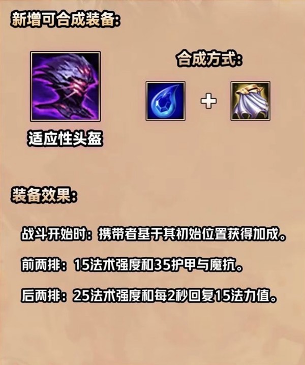 金铲铲之战即将上线S9.5新赛季,玩家可以体验到未见过的新装备,其中就包括改动后的适应性头盔,有很多小伙伴不知道它的具体作用,下面小编就给大家带来详细的装备介绍。