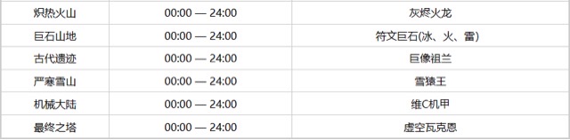 00:00~24:00:符文巨石(冰、火、雷),三个boss同时出现且独立掉落