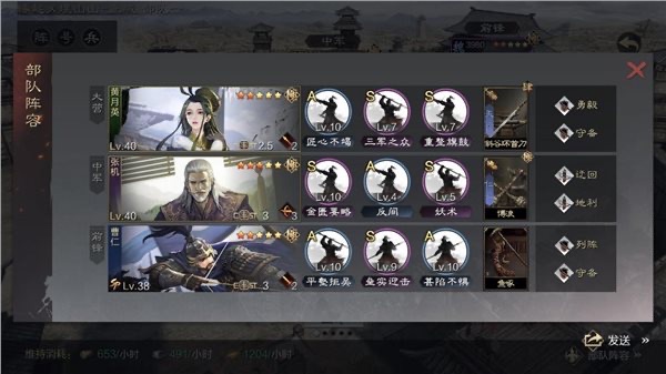 曾想过用贾诩替代月英,战法依旧是【三军】【重整】。由于战局吃紧,就没有更换。但想来,效果应该不差。贾诩代替月英,增加了爆头性,减少了普适性。