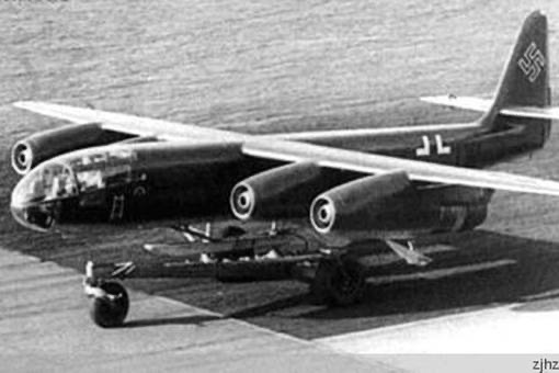 Ar 234喷气式轰炸机。Ar 234“闪电”是德国在1940年末开始进行研制的一型喷气式轰炸机。由于Ar 234“闪电”在1944年9月才开始服役,所以生产数量极其有限。Ar 234“闪电”是世界上首种实用化的喷气轰炸机,有着当时所有盟军飞机都无法拦截的高速,凭借高速执行任务甚至不需要护航。