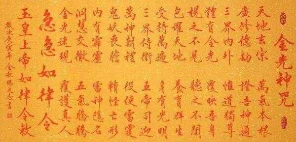 金光咒,道教八大神咒之一,它以修炼道体之心性为主,主张以内炼金光元神护体,降魔卫道!金光咒因用途广泛,传播很广,所以很多普通人都会,而且普通人也是可以念的,有去心火的功效,只不过没有有修行的人念作用大!