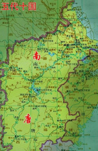 南唐疆域的巨大变化,出现于南唐中主李璟时期,即李昪长子。李璟继承的是杨行密、徐温、李昪三代人打造的无敌江南,实力足以争雄天下。《旧五代史》记载,南唐的地盘东及衢婺,南及五岭,西及湖湘,北及长淮,割据三十多个州,广阔数千里,尽为其所有,近代僣窃之地,最为强盛。