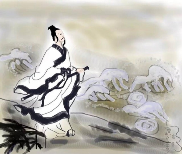 屈原抱着救国救民的志向,一肚子的富国强兵的打算,反倒给排挤出去,他简直要气疯了。他不想吃,不想喝,憋着一肚子忧愤没处去说。他在洞庭湖边、汨(mì)罗江(在今湖南东北部)上,一边走,一边唱着伤心的歌。他面容憔悴,披头散发,骨瘦如柴。