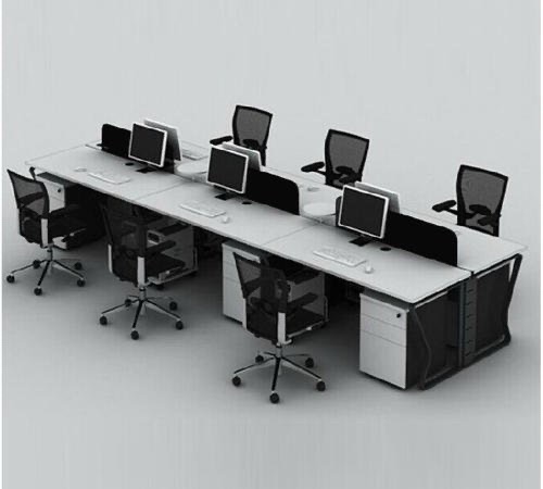4、屏风办公桌:将办公之间通过屏风分隔成不同区域的办公桌,一般是几个拼接在一起。