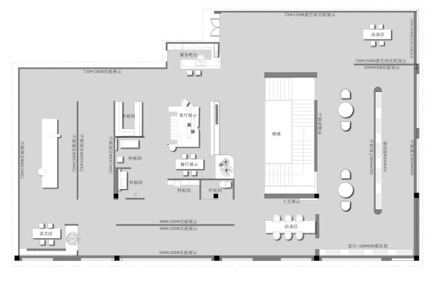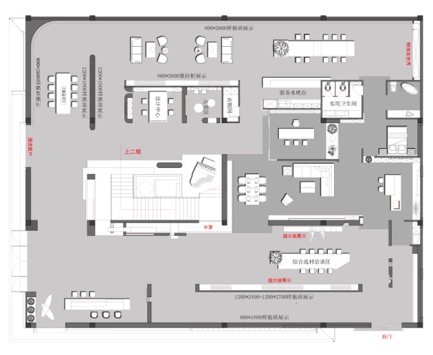 大面积选材区域带来开阔的空间感受,搭配多规格、多花式、多种类的产品排列,进退自如的材料区布局,行走间便可启发无限装修灵感。