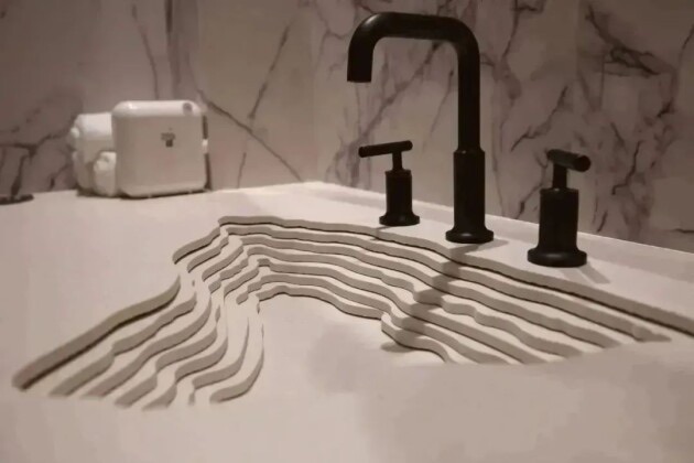 冠珠岩板“万物皆可覆”的优越性能,给空间设计带来了新颖的美学和质感体验。简约的线条、不规则的几何造型设计感强烈,漫步其中,以小见大,打造缝隙窥探的一步一景既视感,体现了冠珠在空间上的塑造多样性。
