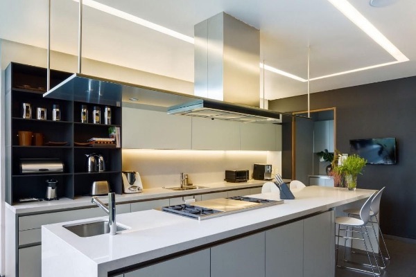 抽屉设计在厨房中是很常见的,通常与橱柜结合设计。譬如说踢脚式抽屉,使用就很方便,取物品时,用脚轻轻一按,然后打开取出物品用脚一压就关上了,使用非常方便。水槽位置也可以抽屉,用来收纳洗碗布、洗洁精、垃圾袋等等。